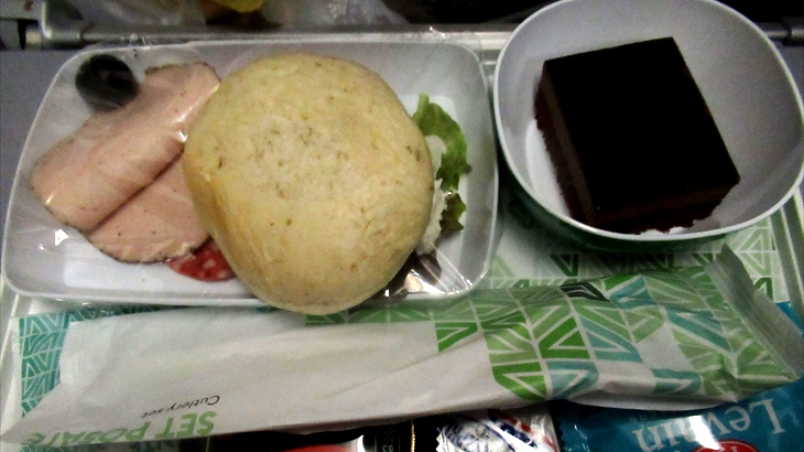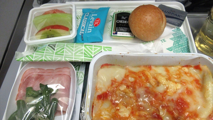 約13時間のフライト、気持ちははやります。2時間ほどして初めての機内食とワインを頂き、寝ようとおもいますが中々寝付けません。