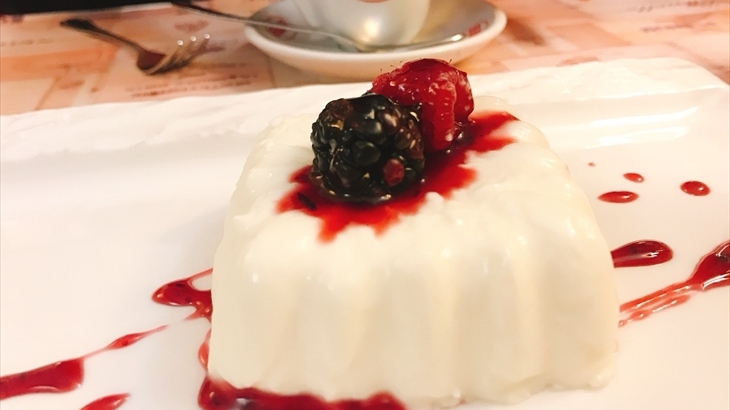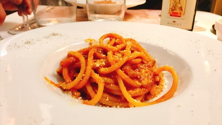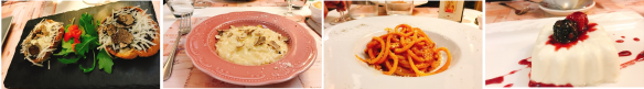 注文したお料理はパンの上に玉ねぎとトリフのスライスを乗せた前菜、白トリュフのリゾット、アマトリチャーナ(イタリア料理に使われるパスタソースのパスタ)、デザートはパンナコッタとイタリア料理大集合、今回旅行の最後の晩餐です。