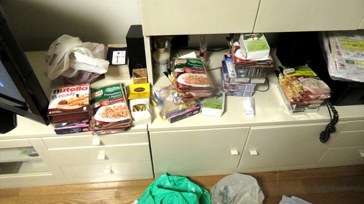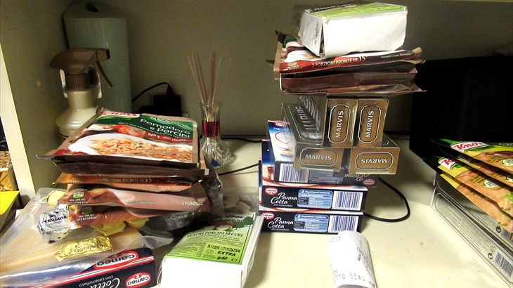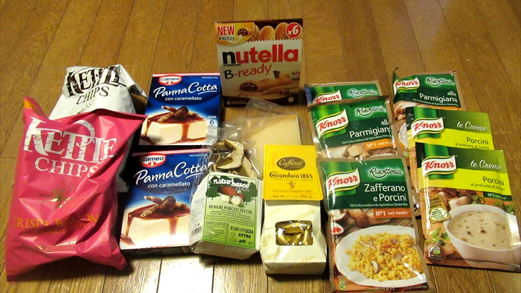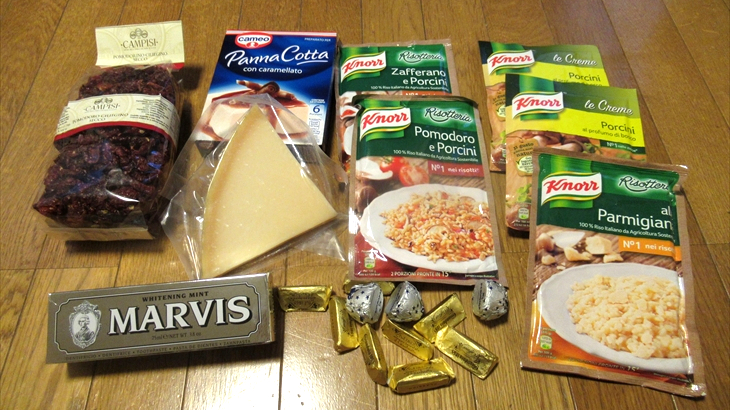 お土産は現地のスーパなどで買い込んだスープ、リゾット、パンナコッタ、チョコレートなどの食料品、日本では1本2000円位する歯磨きチューブが現地では500円位だったので大量購入。