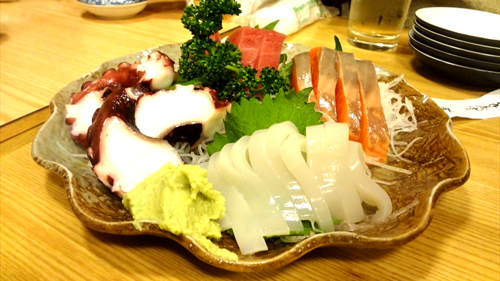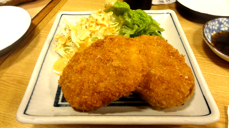 お刺身の盛り合わせ(4品)と直径10cm位・厚み1cm位のコロッケが2個、キャベツが添えられたお皿に乗せられやってきました。乾杯ビールを飲み干したので、ハイボールを注文。