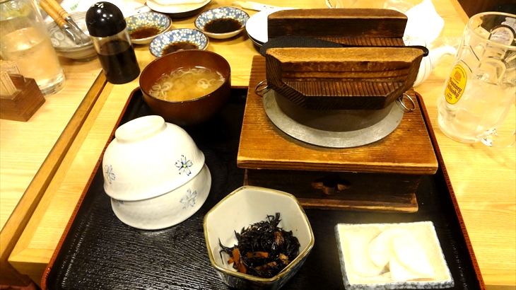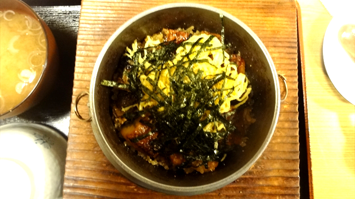 そして後半に注文した大きなホッケ焼きが届き、冷酒を注文。そして2回目の看板料理「うなぎの釜めし」、釜めしというよりたっぷりのタレで混ぜられた鰻ご飯という感じ、美味しかったですが、釜めしをイメージしているなら別の釜めしメニューを選択した方が良いです。