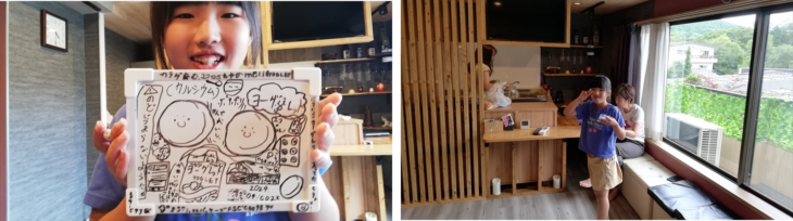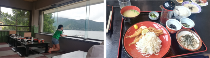 今日から8月になりました。朝ご飯は昨日購入したブドウパンを食べマンションで温泉はいったりゆったり。お昼ころ出発して湖尻の「うえの」へワカサギ定食を食べに行きました。アヤちゃんも含め全員ワカサギ定食とトロロ2つを注文。