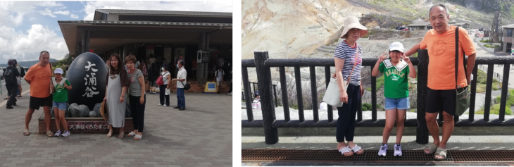 冷凍ワカサギ定食の後は湖尻から車で15分ほどの大涌谷へ久しぶりに行きました。アヤちゃんは初めてですね。観光スポットなので記念撮影。