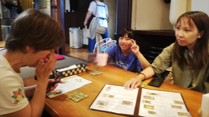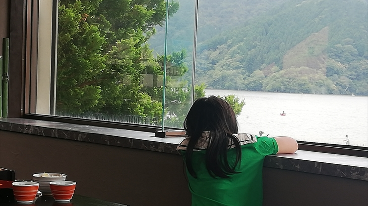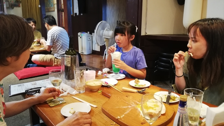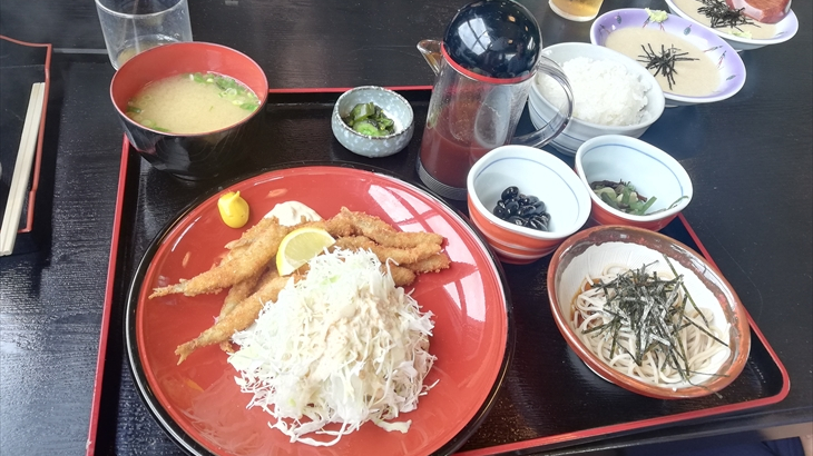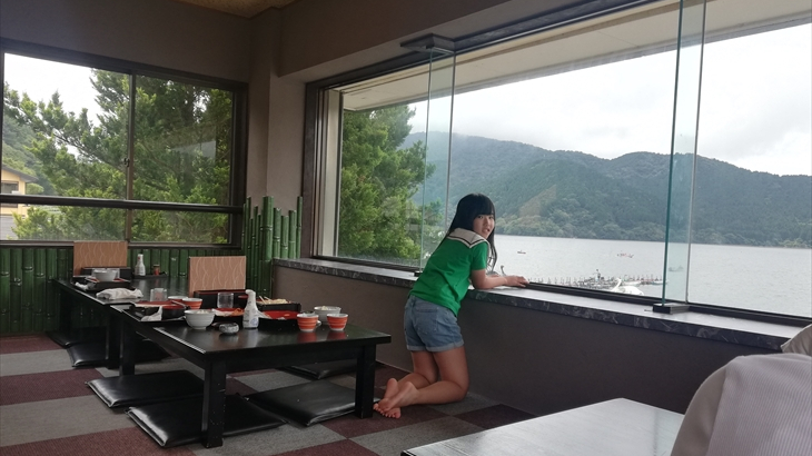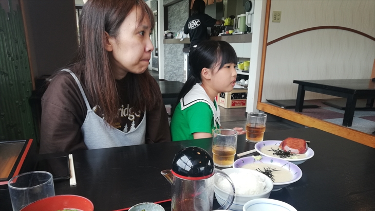 今日から8月になりました。朝ご飯は昨日購入したブドウパンを食べマンションで温泉はいったりゆったり。お昼ころ出発して湖尻の「うえの」へワカサギ定食を食べに行きました。アヤちゃんも含め全員ワカサギ定食とトロロ2つを注文。