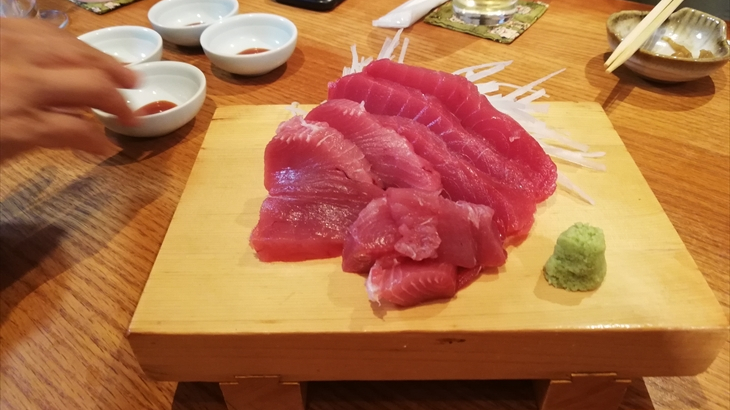 最初に注文したのは、今日から提供されるキハダマグロのお刺身とカルパッチョ、枝豆です。私はハイボール・生ビール、律子さんは白ワインボトルです。