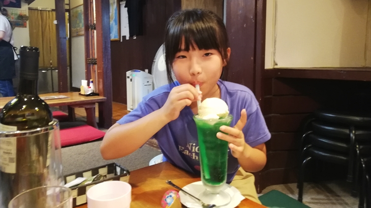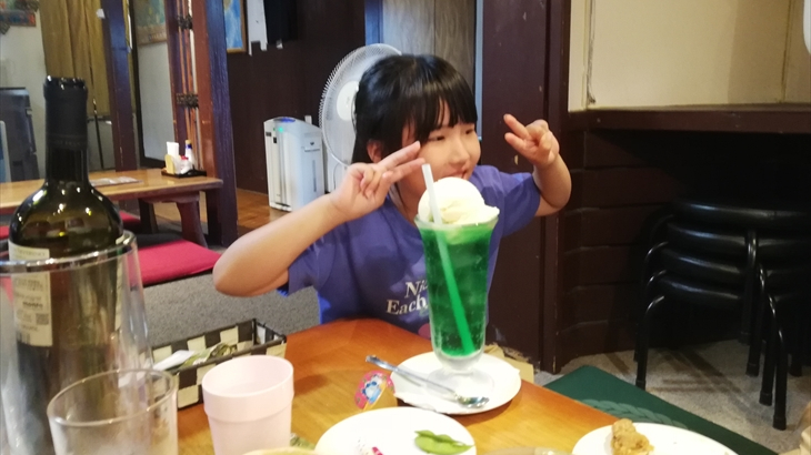 ピザ、ガーリックライス、もう一度枝豆、塩ラッキョウなどいろいろ食べました。最後はアヤちゃんのビックなクリームソーダです。XIV夕食もいいけど、こちらもいいね。2時間強の食事を終え、お部屋に戻りました。