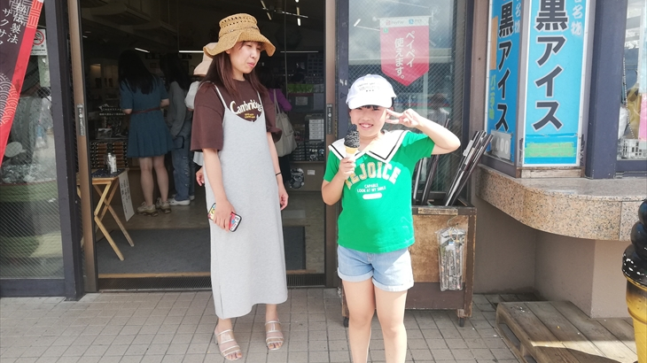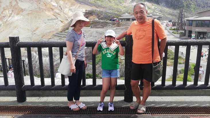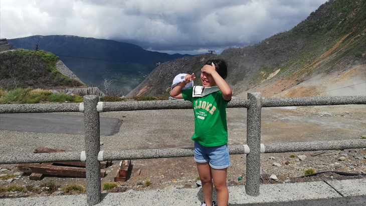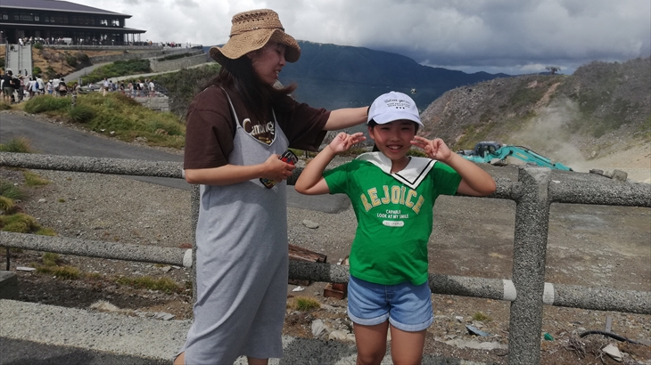 冷凍ワカサギ定食の後は湖尻から車で15分ほどの大涌谷へ久しぶりに行きました。アヤちゃんは初めてですね。観光スポットなので記念撮影。