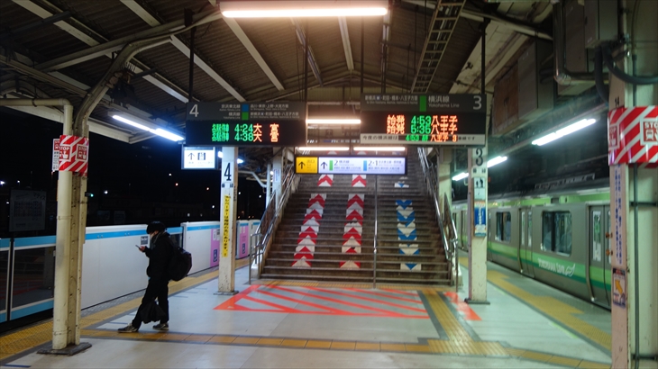 朝4時に起き自転車で小雨降る中傘さして東神奈川駅まで行きました。東神奈川駅4時24分の始発電車に乗り込みました。