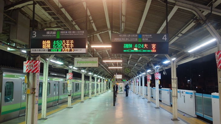 朝4時に起き自転車で小雨降る中傘さして東神奈川駅まで行きました。東神奈川駅4時24分の始発電車に乗り込みました。