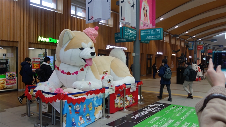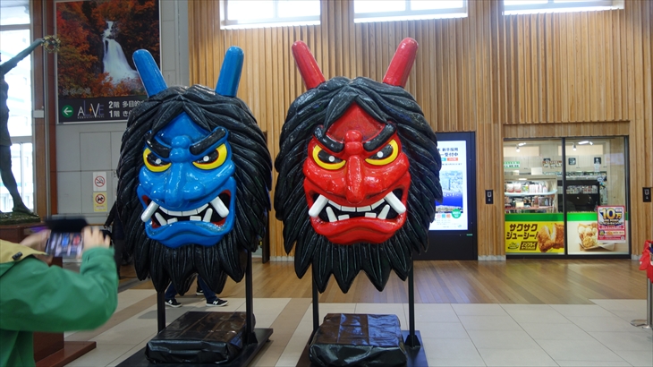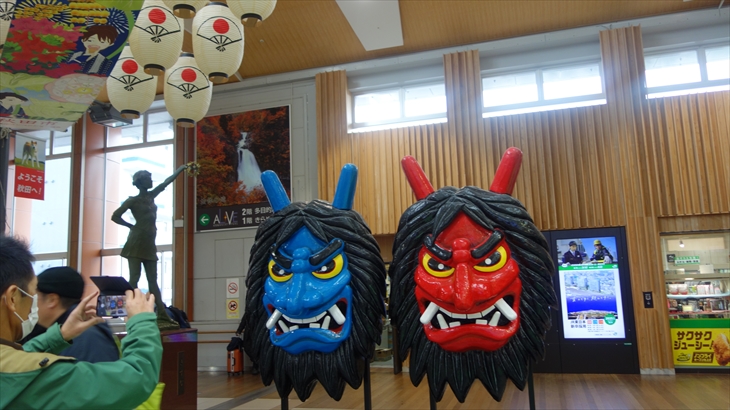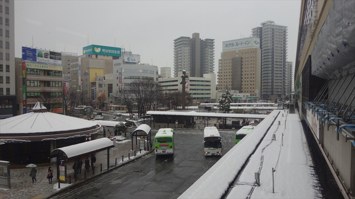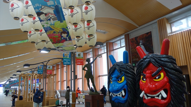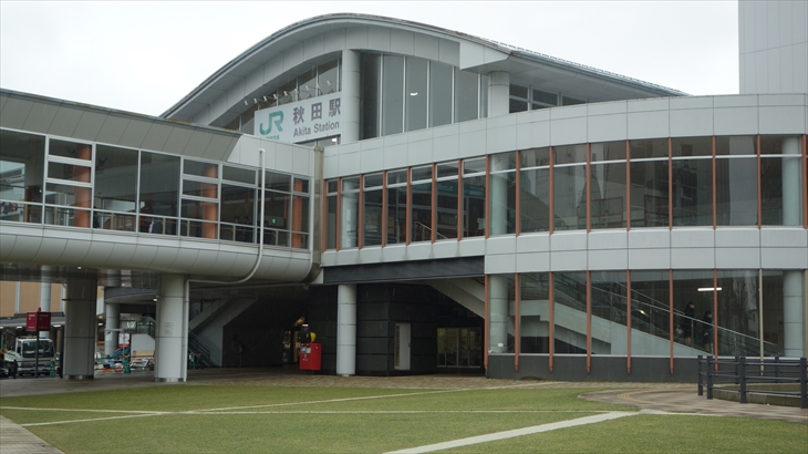 盛岡から秋田までは新幹線こまち、この電車は全席指定席なので盛岡に着く前に「えきねっと」で数席しか残っていない指定券を購入、満席です。隣の外国の方が子供達と離れ離れの席で困っていた様子なので変わってあげました。秋田駅には11時24分頃到着。雪積って無かったことに少しびっくりです。