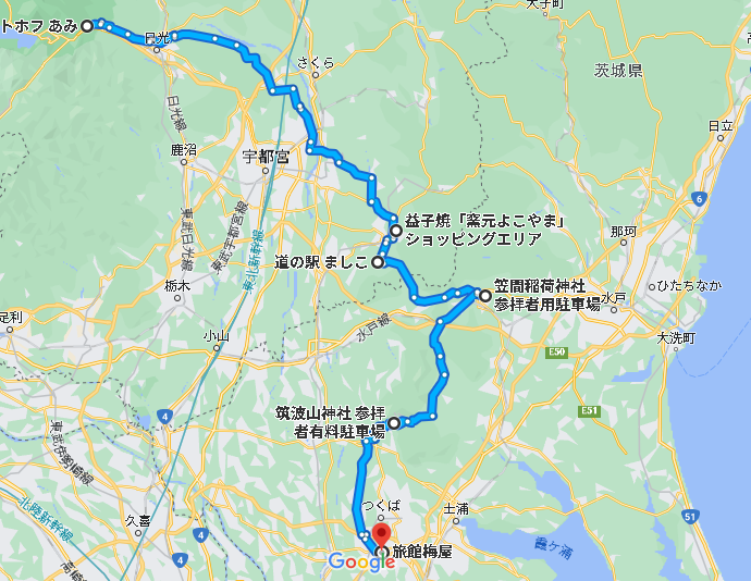 2023年9月16日、関東一周3日目は日光東照宮付近のペンション「あみ」から焼き物の町益子を経由して筑波山へ向かいます。本日のメインは標高877mの筑波山登山です。