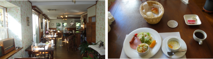 朝食は7時からですが10分前に覗いてみると「もう準備できました」といわれたのでお願いしました。座席は昨晩の夕食と反対になってました。ペンションらしく洋食、美味しくいただき、8時少し過ぎに出発しました。