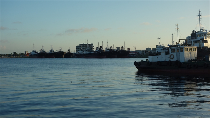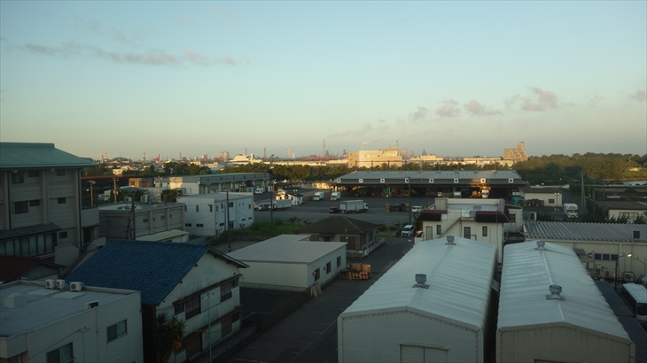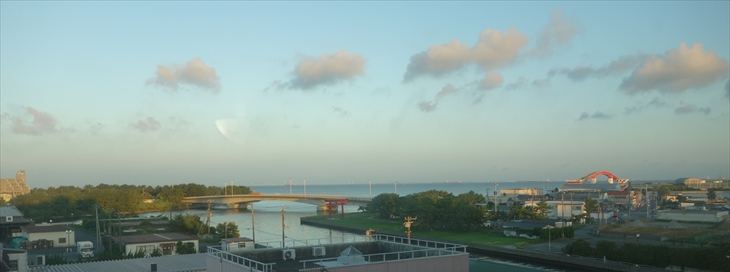 朝6時、ホテルの窓から、お天気は晴れ。お部屋から撮影した海です。