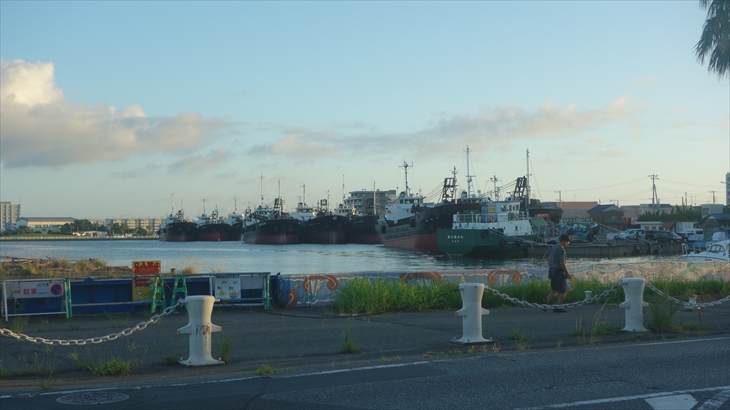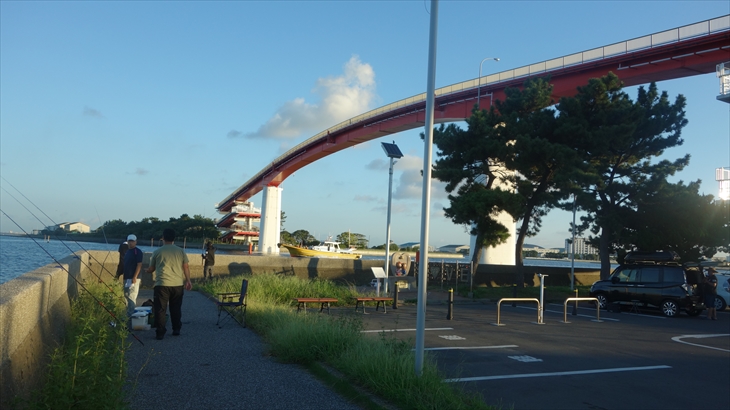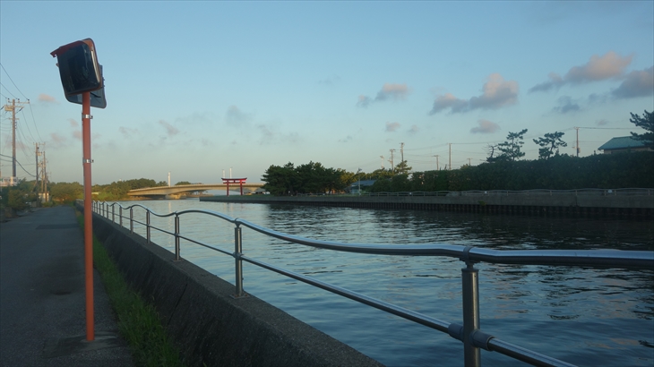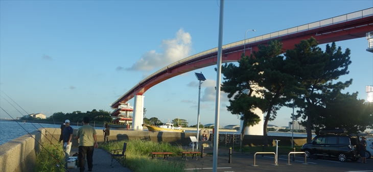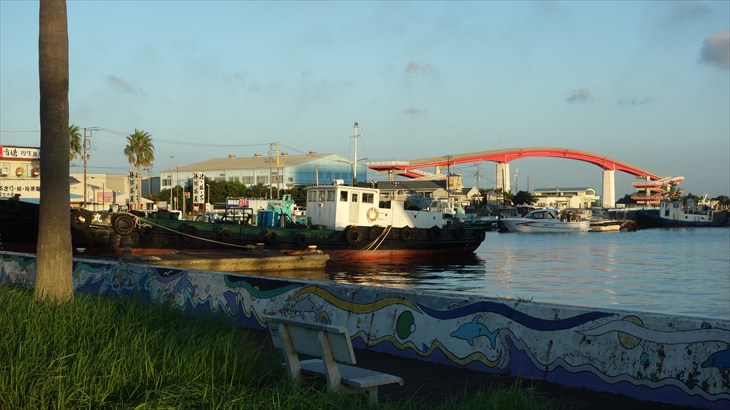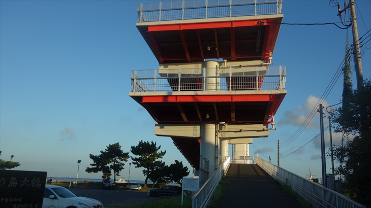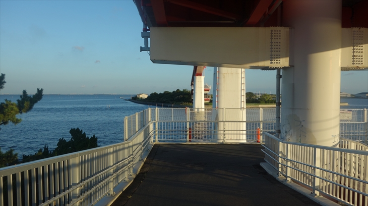 朝5時ころ起床し、シャワー浴びて39分ころに朝散歩にでかけました。取り合えづ木更津港を目指し歩いていると、海に架かる大きな赤い橋が見えてきました。これは中の島大橋といって高さ27m、長さ236mの日本で一番高い歩道橋らしいです。