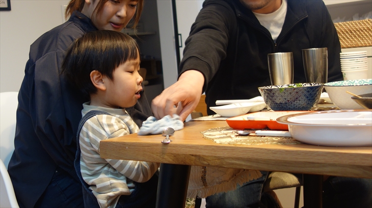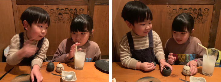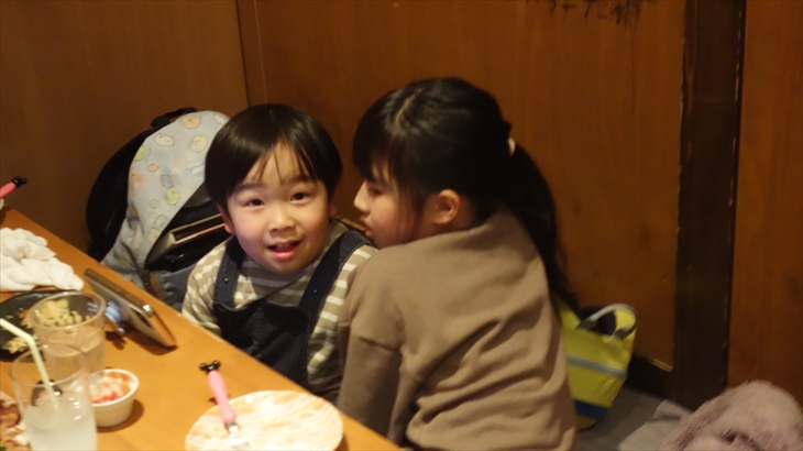 利太朗くんとアヤちゃんは比較的おりこうさん。いつもなら二人で大声だして走りまわるところお座りして食事を楽しみました。アヤちゃんはとっても楽しかったようです。
