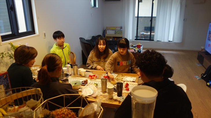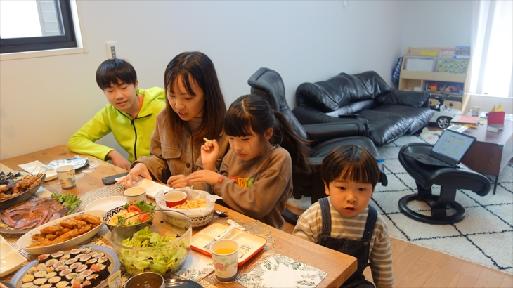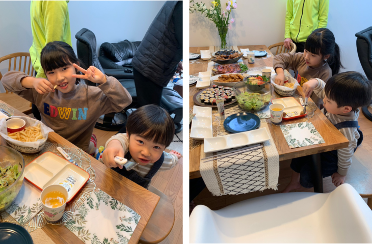 一番大変だったのはホスト(招待者)です。テーブルセッティングやお花、壁アート。お料理も利太朗くんの好きな手羽先の甘辛、巻きずし、サラダ、ポテトなどとても豪華なパーティになりました。