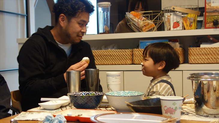 利太朗くんとアヤちゃんは少しお腹が一杯になると席を離れ遊び始めます。テーブルに残ってるのは大人チーム、いつの間にかトシ君も大人チームの仲間入りしてます。