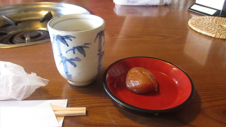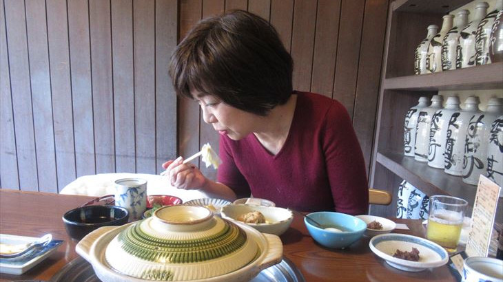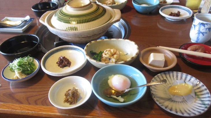 入店するとお客様は我々を含め3組、ここもガラガラです。湯豆腐定食(3800円で10品)と日本酒を注文、最初に梅干しとお茶が登場しました。小皿6品と湯豆腐をゆっくりと食べること1時間、春野菜の天ぷらとデザート、15:00です。