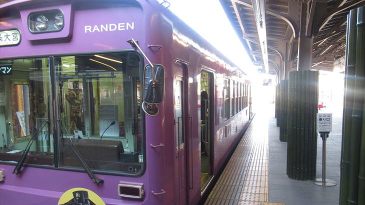 嵐山駅は観光客が喜びそうなお洒落な駅、嵐山本線は紫色1車両の路面も走る江ノ電みたいな電車です。終点の四条大宮まで約20分、駅から徒歩5分で四条堀川のtheBホテルまで行けました。ラッキー・・・・