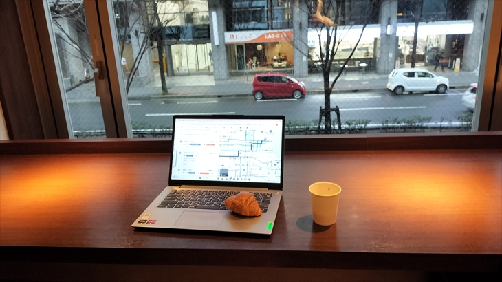 我々が宿泊したのは「ちぇっくいん烏丸」ホテルの204号室、この部屋は6:30~20:00まで利用できる朝食会場の隣の部屋で、フリードリンクで広々とパソコンなど利用できるので超便利。