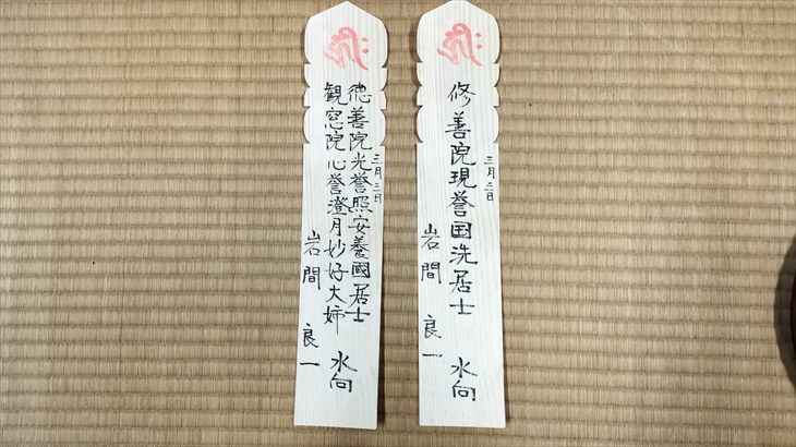 10時45分に富美恵さんと平安寺で待ち合わせ。平安寺は日蓮正宗で母親(陽江)、清江さん、照夫さんが過去に入信していると聞いていました。昨日、父親と母親の戒名を富美恵さんから付けた方が良いと言われ困ってましたが、本日の塔婆に戒名を書きたかったのだと分かりました。なぜか、父親(久雄)の塔婆が建てられて一緒に供養するとは思いませんでした。結構、自由なのですね??