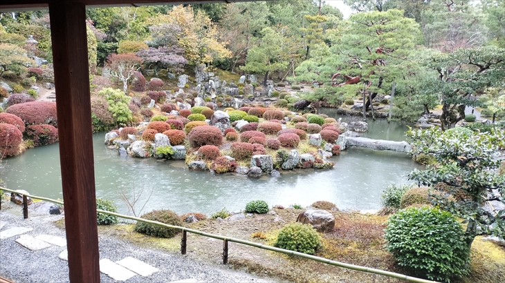京都市バスはオレンジ色の200番台のバスが循環バス、青い番号のバスは目的地バスという区別を学びました。203番バスで四条高倉から一周し、205番バスに降り変え、衣笠高校前で下車し1kmほど歩き等持院に13時ころ到着しました。