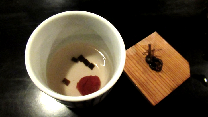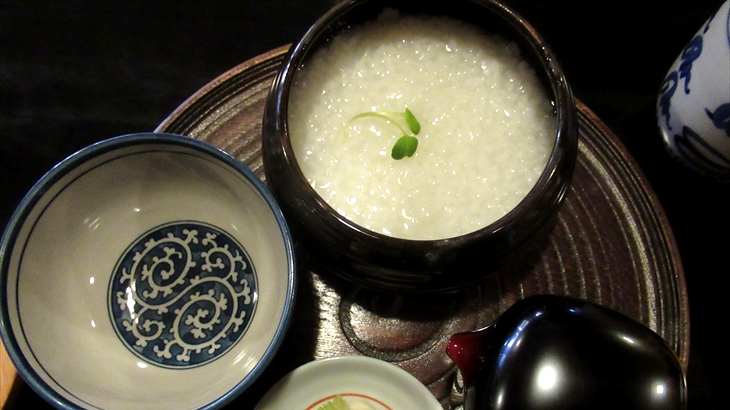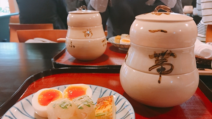 着席後に温かいおしぼりと梅湯、前菜と瓢箪重が同じお盆で登場し椀物と朝粥を美しさと歴史ある空間で頂きました。400年前、江戸時代の人達と同じ朝粥を食べたのは感慨深いです。