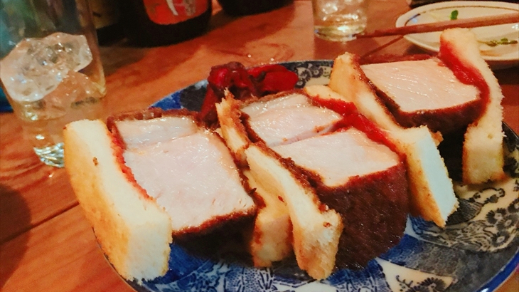 娘が先輩から推薦してもらった丸田町のとんかつ清水はカツサンドが有名です。カツサンドを注文してみると、とんかつを揚げて馴染ませるまで約20分待って登場したのが厚みが4cm超のカツサンド。びっくり!!
