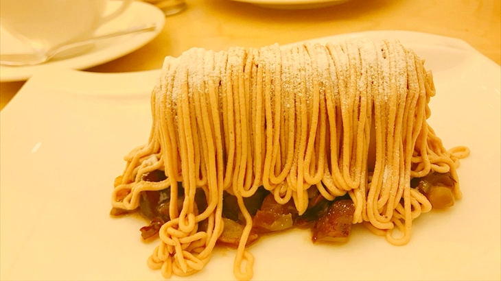 瓢亭の朝粥はお昼ご飯と兼用だったので、マールブランシュ北山本店でお茶しました。ショートケーキとモンブランを目の前で作りあげるパフォーマンスデザートのモンブラン・オートクチュール(1404円)を注文。お値段もさすがです。