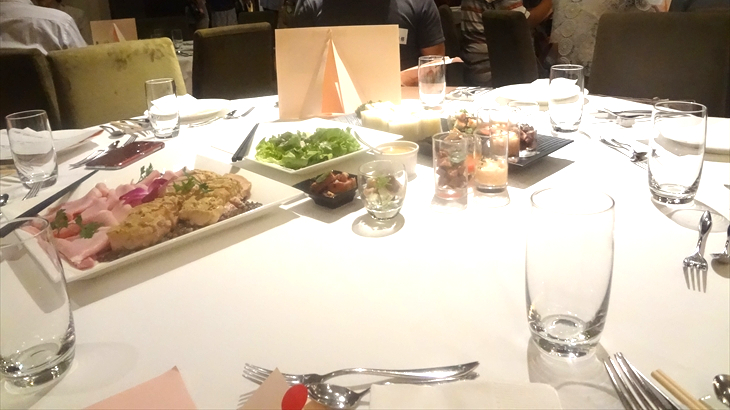 6時10分ころ会場に到着。受付で会費を支払い名札と参加者・欠席者の近況を記したレシメを頂き、席順を決めるクジを引きました。まだ開催まで時間があるので着席している方は半分くらい。最初は緊張感があるようでクジ指定席の隣の方々と近況等の世間話をしているうちに満席になり、定刻通り6時30分に同窓会は開始されました。