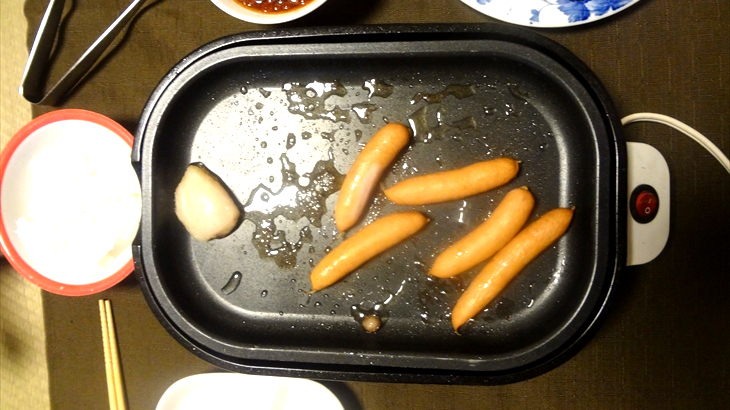 野菜高騰で学校給食が中止とのニュースの中、100円ローソンで購入した野菜ミックスで作った野菜炒めは胡椒が子供には辛かったようです。ウインナーも焼き、簡易ホットプレートは大活躍。