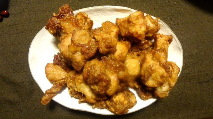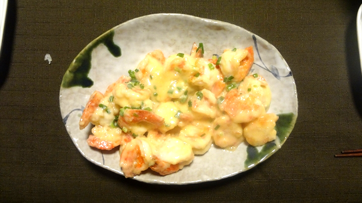 お肉屋さんで購入した唐揚げ、日本食研のタレで作った海老マヨ、次作る時は海老の尻尾とった方が良いと学習し、ニョッキと自家製ミートソースのグラタンが本日のメニュー。