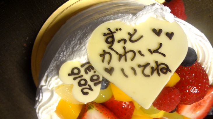 最後はお誕生日ケーキ、パパが準備してくらたケーキには「ずっときれいでいてね」というメッセージが添えられていました。