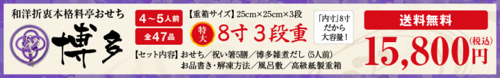今年注文した「和洋折衷本格料亭おせち:8寸3段重(15,800円)」の博多久松の特徴は