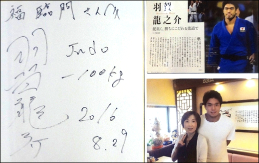 お店の入口には今年のリオオリンピックの柔道100kg級で銅メダルを獲得した地元のヒーロ「羽賀龍之介」が帰国(8月15日)の2週間後(8月29日)に来店した時の写真とサインが飾ってあります。