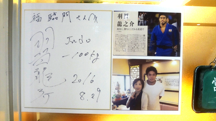 お店の入口には今年のリオオリンピックの柔道100kg級で銅メダルを獲得した地元のヒーロ「羽賀龍之介」が帰国(8月15日)の2週間後(8月29日)に来店した時の写真とサインが飾ってあります。