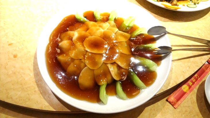 早速、各自飲み物を注文。ヤッパリ最初の1杯は生ビールで乾杯し、紹興酒ボトルを追加注文。最初のお料理、クラゲ、チャーシュ、トコブシ煮を大皿に盛りつけた「特製冷菜の盛り合わせ」、円卓と回転テーブルで食事会が始まりました。