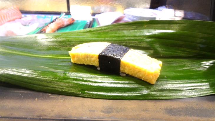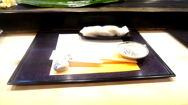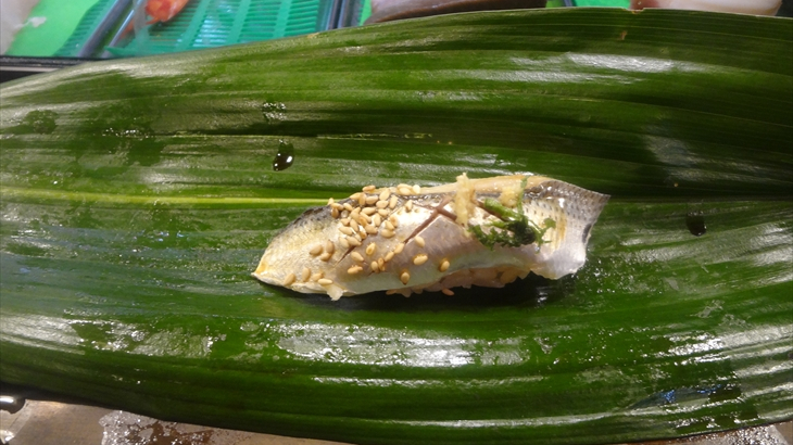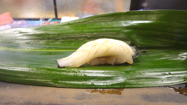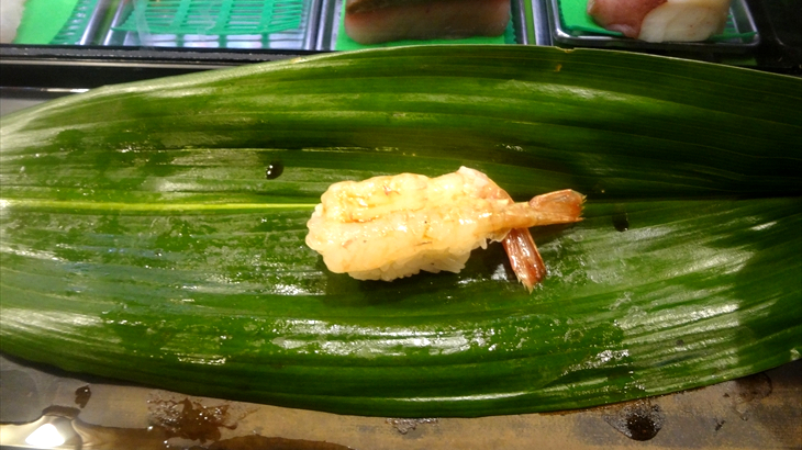 お寿司のセット握りは税抜で1800円、2000円、2500円、3000円、他に5000円のおまかせ握りがあります。今回はお正月なのでおまかせ握りを注文しました。大将が握った寿司はガラスケースの前にセットした八丈島特産のアシタバの葉の上に一貫ずつ乗せてくれます。