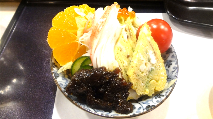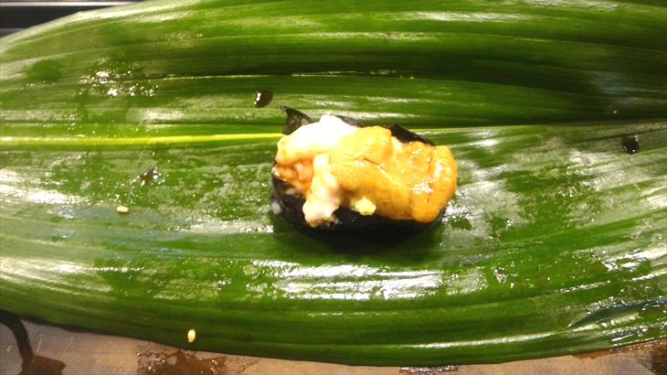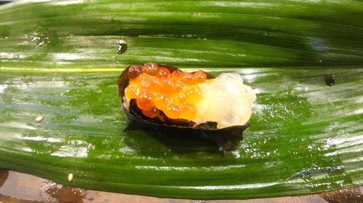 途中、女将さんが作ってくれる寿司ネタ、フルーツ、野菜を小鉢に盛り合わせたサラダは箸休めと口休めになります。後半は、ブリ、イクラ軍艦、ウニ軍艦、コハダ、ボタンエビ、最後はアナゴ握りでした。