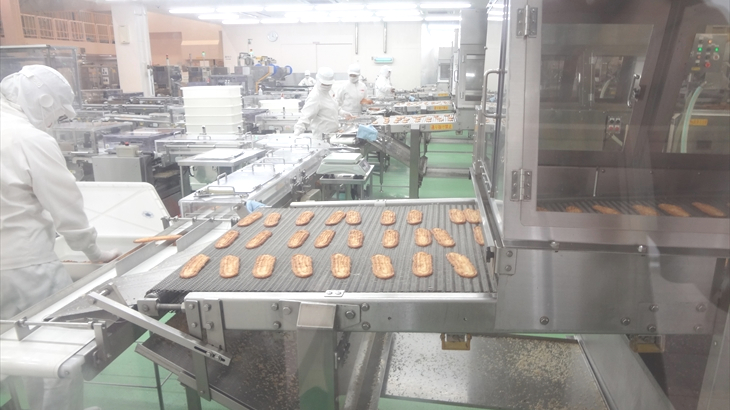 それでも、受付を行うとその場でミニうなぎパイが3枚入った参加賞を人数分無料で頂けます。お菓子を受取り順路どうり歩いていくと、一階ではベルトコンベアに乗ったうなぎパイを焼き、はけで味付けされている様子を見学できます。