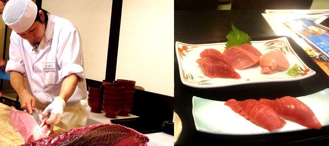 しばらくすると、まぐろの解体ショーが始まりました。せっかくだったので中トロ握り2貫(760円)とマグロ3朱盛り(1990円)を次女が買ってきました。それなりに美味しかったです。