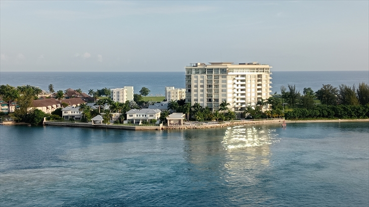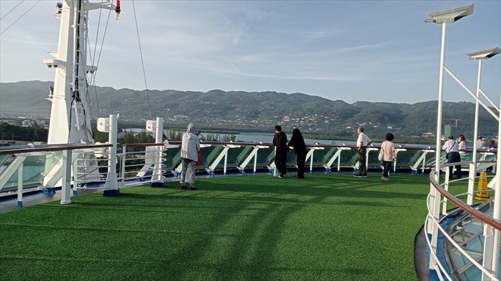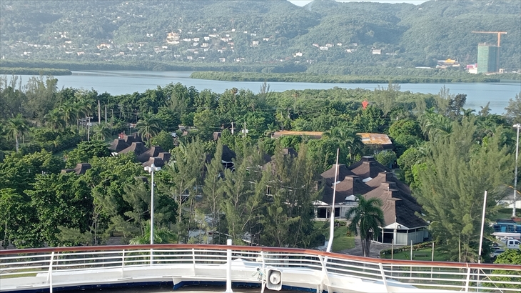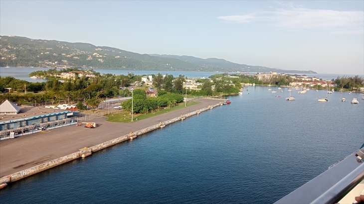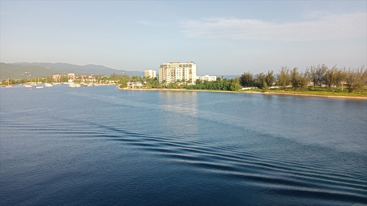 朝日が昇り少し明るくなった6時頃、ジャマイカが右舷に見えてきました。そして予定通り7時に着岸、目の前にクルーズターミナル&ショッピングという建物が見えてきました。