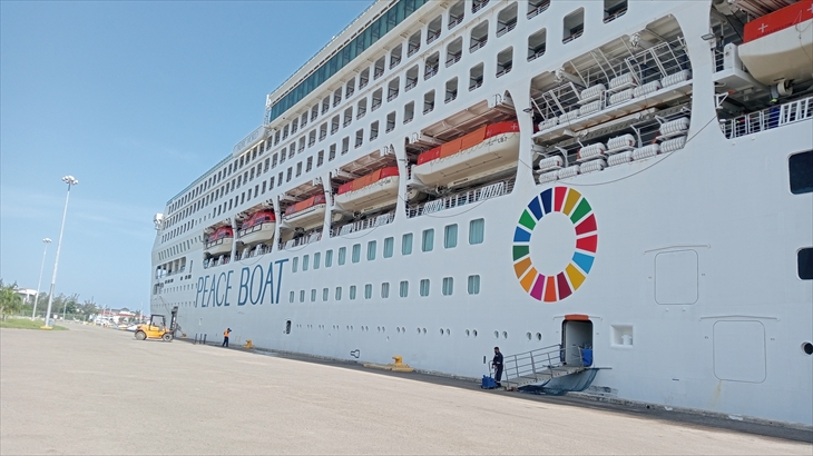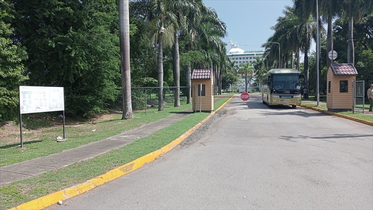 9時45分に5階で待ち合わせしターミナルへ向かいました。ターミナルの外に迎えの車があると思ってましたが居ません。電話してみると「メインロードにいる」と言っていますが、それが何処だか分からず困っていました。「寄港地のいろはを」説明するピースボートスタッフの方を見つけ、電話を替わってもらい、迎えに来ている場所を教えてもらいました。外の公道に居るとの事。セキュリティの関係でターミナル内には入れない様です。感謝です。そして10時、無事にドラーバーと会うことができました。でも地元のドライバーなら最初から事情は分かっているはず。待ち合わせの場所の指定が甘いな、と今なら思います(その時は気付かず)