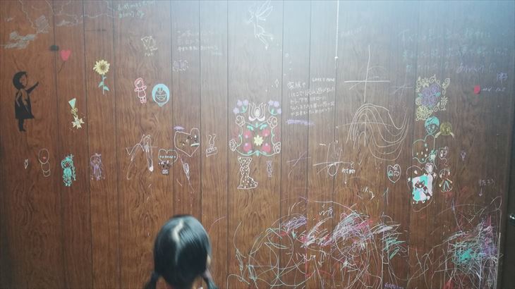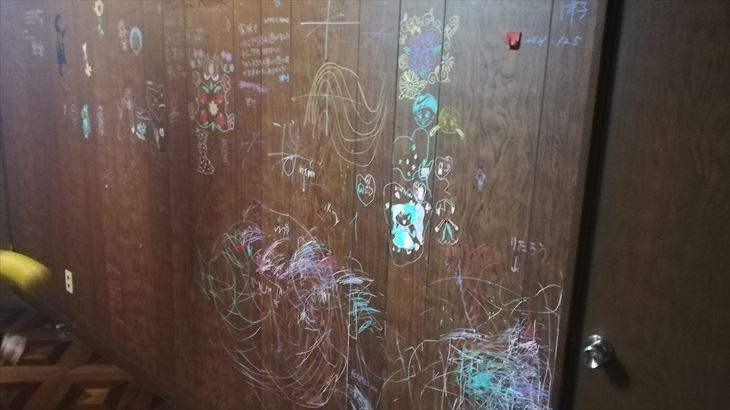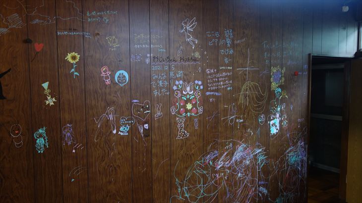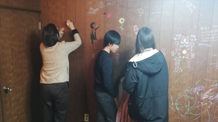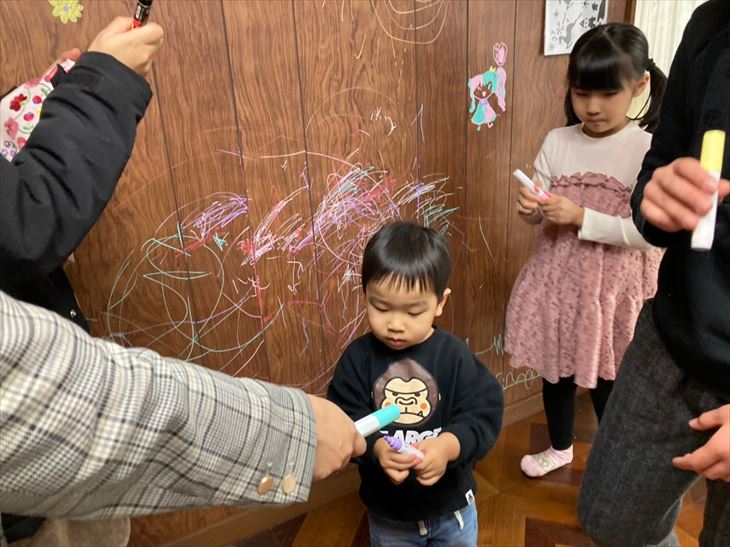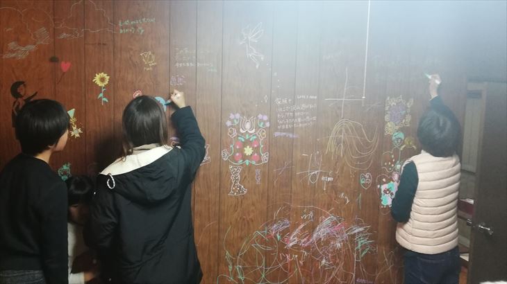お昼ご飯の後、ミユちゃんが準備してくれた壁アートに挑戦。最初はお絵描き好きなアヤちゃん、利太郎くんも頑張りました。