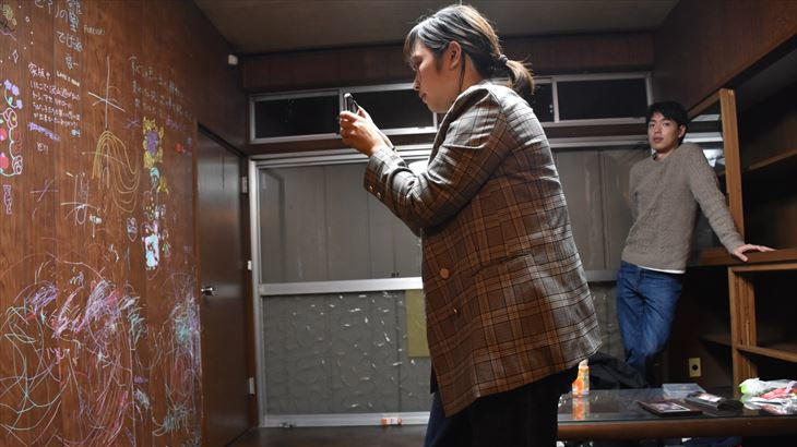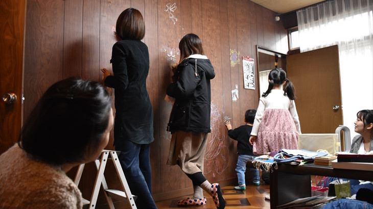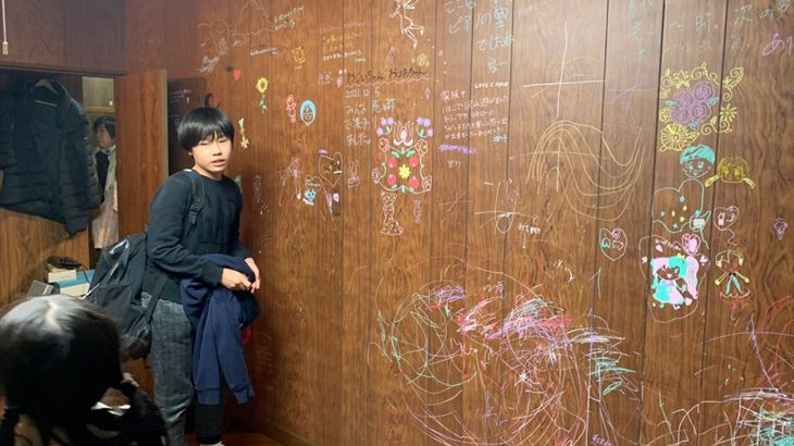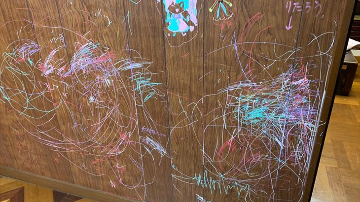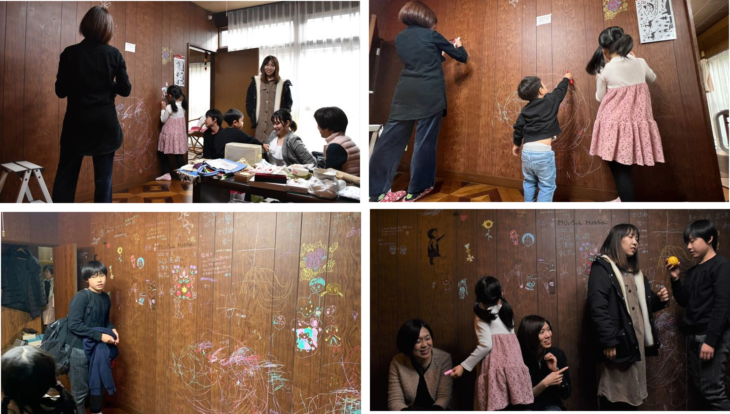 住宅解体前にピアノがあったリビングの壁一面にクレヨンマーカで絵を描くイベント準備をミユちゃんがやってくれました。このアイデアを思い付いたのは流石です。最初にお絵描き好きなアヤちゃんが挑戦、利太朗くんも何か書き始めました。