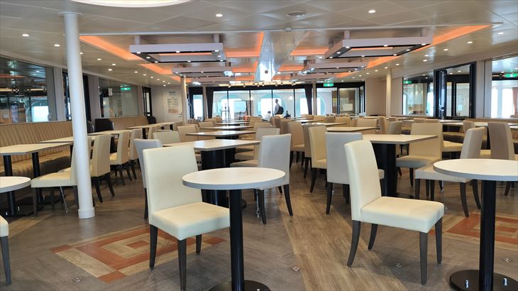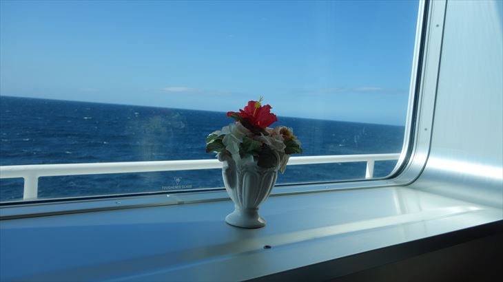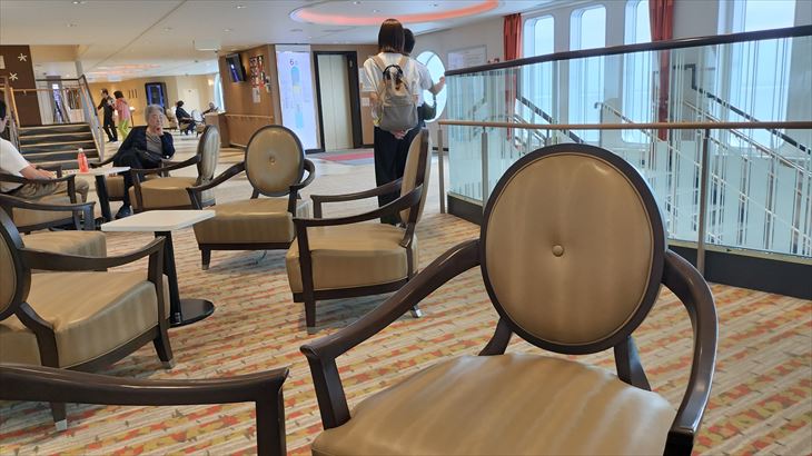 ほとんどの人がカプセル寝室やお部屋にこもっているのでロビーは空いていました。また、朝食が終わる9時以降は朝食会場は無料開放されるので陸地が見える窓側の席を確保してゆっくり出来ました。今回は無料開放のアナウンスが無かったので、ほんの2~3名しか利用していなかった。