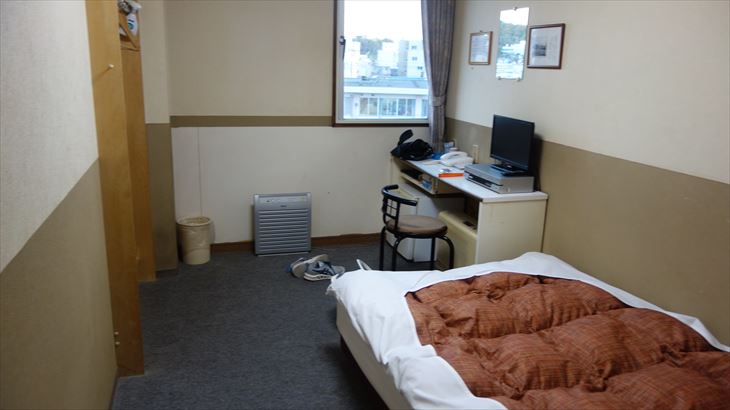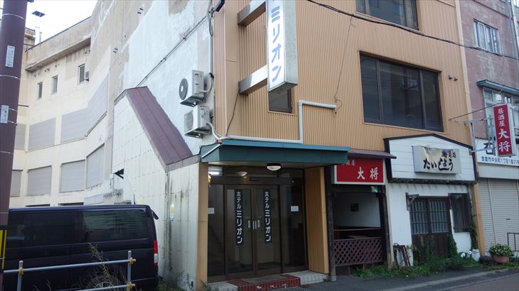 本日の宿「ホテルミリオン」は1泊2食で6600円。外観、共有部分は10点、お部屋は最低機能があるので30点です。