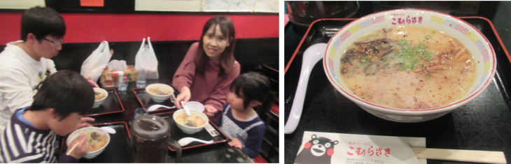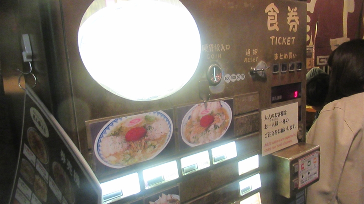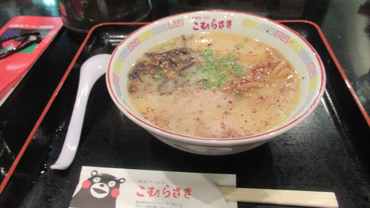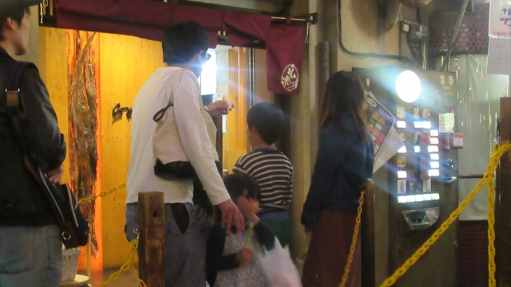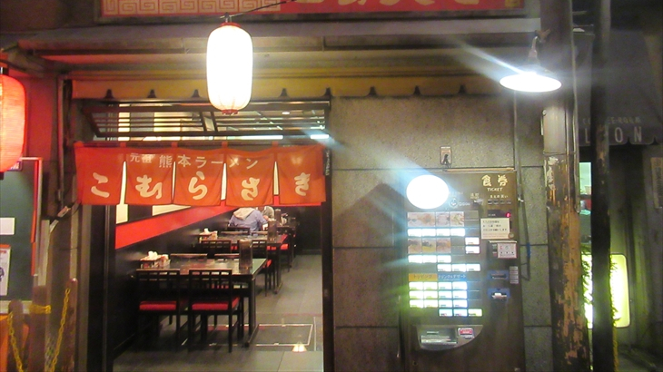 ラーメン博物館に到着したのは19時、さっそく地下2階の昭和28年創業熊本ラーメン「こむらさき」の想定待ち時間30分の行列に加わりました。券売機でミニラーメン(570円)を6名分購入し、入店できたのは19時22分。細麺とんこつラーメン・・・・