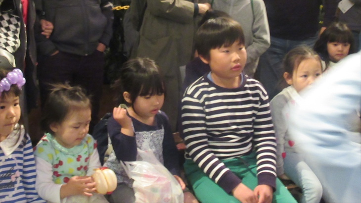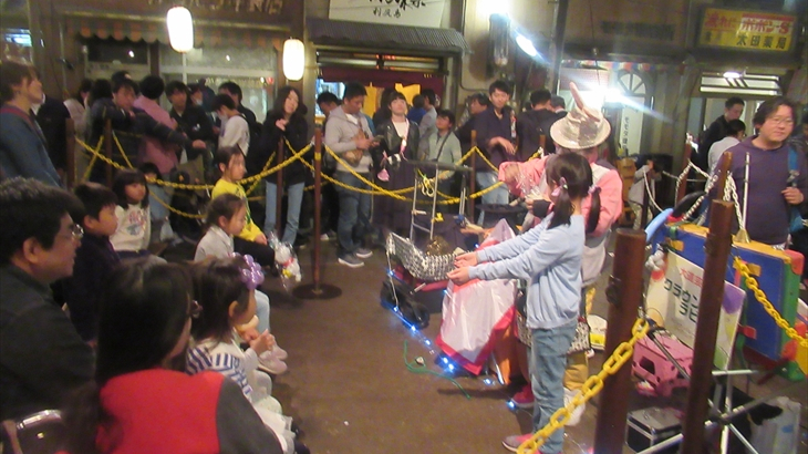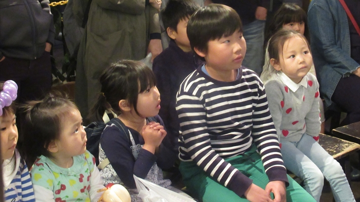 地下2階で開催されている大道芸を見学、最前列に孫達は案内され真近で珍しように見ていました。