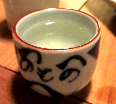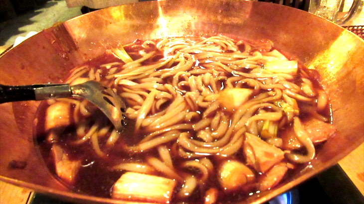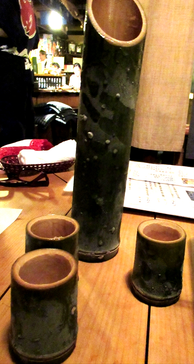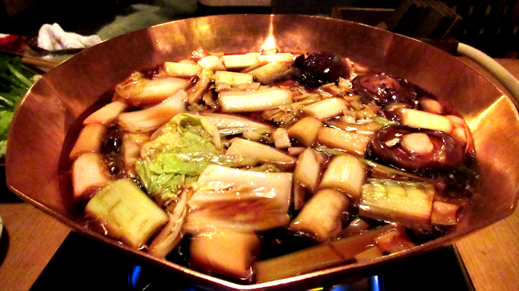 竹酒も無くなったので、2合熱燗を数回注文、好きなオチョコを選べます。しばらくして、本日の主役「ねぎま鍋の具材」と黒い出汁が入った銅製の鍋が登場。